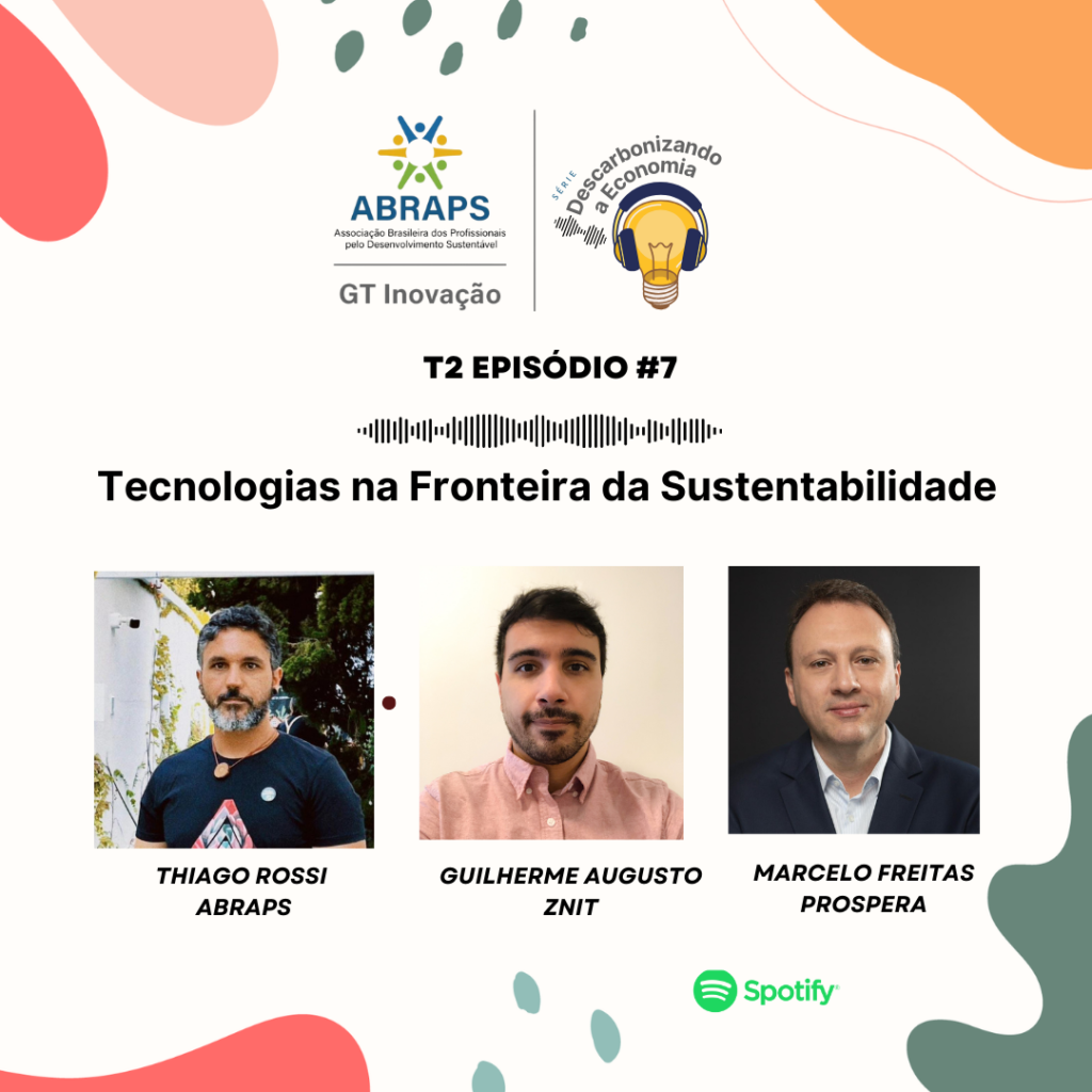 O episódio “Tecnologias na Fronteira da Sustentabilidade” do ABRAPS Podcast/Série Descarbonizando a Economia reuniu dois destacados profissionais, Marcelo Freitas, CEO da Prospera, e Guilherme Augusto, especialista em Mudanças Climáticas da ZNIT, o host Thiago Rossi.